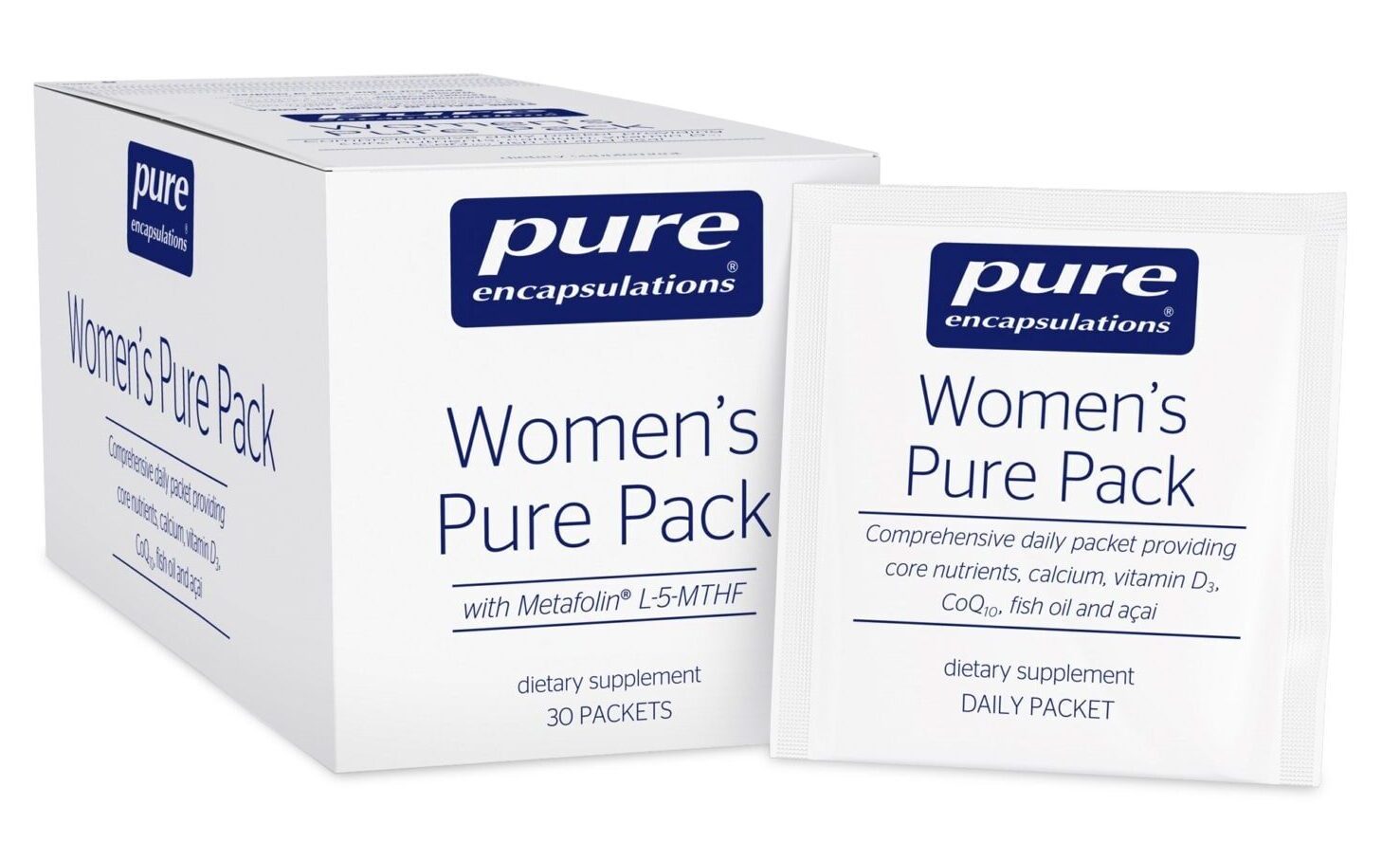 Women’s Pure Pack is designed to promote emotional health, as well bone, cardiovascular, macular, and breast cell health with a comprehensive profile of bioavailable vitamins, chelated minerals, fish oil and other ingredients. Vitamin and minerals act as cofactors to support energy production, while the herbal adaptogens rhodiola and lemon balm help moderate occasional stress. Each packet contains 500 mg calcium and 37.5 mcg (1, 500 IU) vitamin D3 to support healthy bones. Omega-3 fatty acids, CoQ10, and polyphenols from acai, cranberry, pomegranate, red wine concentrate and grape seed extract promote healthy cardiovascular function. HMRlignan™, calcium-d-glucarate, green tea and curcumin help support breast cell health. Lutein, zeaxanthin and nutrient cofactors enhance the integrity of the macula and retina.
